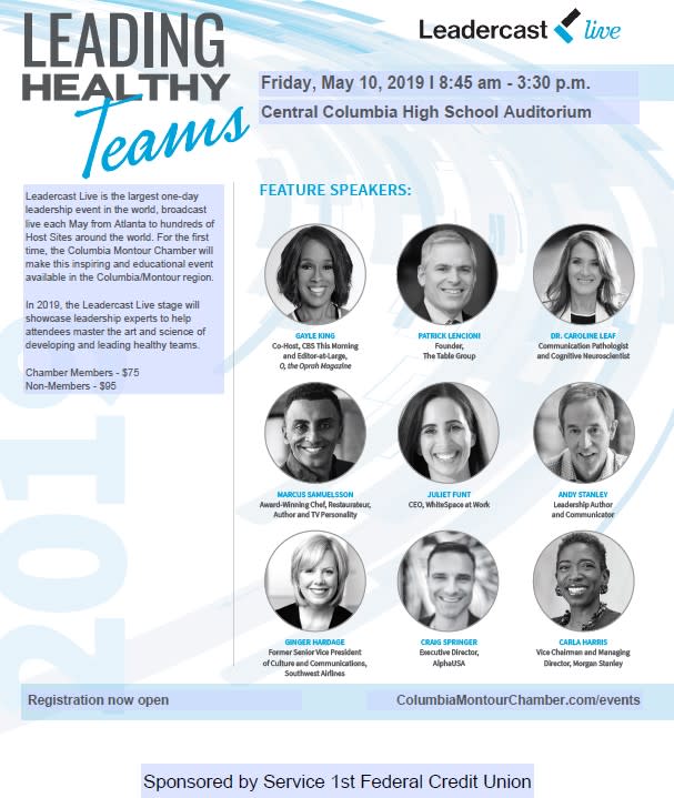 Leadercast Live is the largest one-day leadership event in the world, broadcast live each May from Atlanta to hundreds of Host Sites around the world. For the first time, the Columbia Montour Chamber will make this inspiring and educational event available in the Columbia/Montour region, with Central Columbia High School (auditorium) serving as the host site, and Service 1st Federal Credit Union serving as the site sponsor.