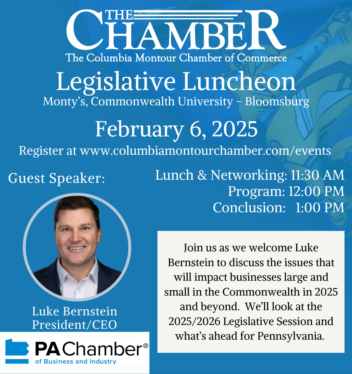Join your Chamber as we hear from Luke Bernstein, President/CEO of the Pennsylvania Chamber of Business & Industry, and discuss what to expect from the Commonwealth in the 2025-2026 Legislative Session.Images