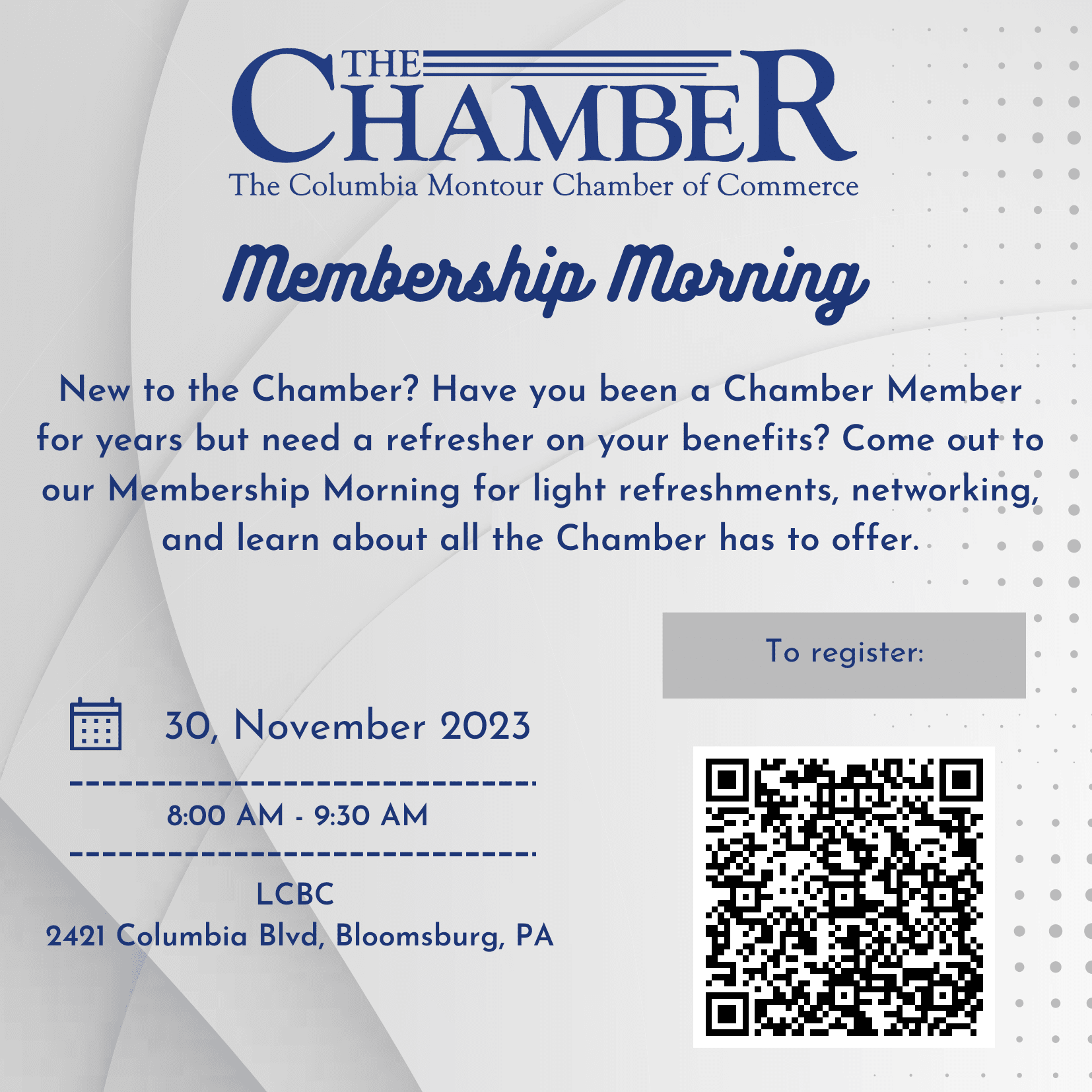 New to the Chamber? Have you been a Chamber Member for years but need a refresher on your benefits? Come out to our Membership Morning for light refreshments, networking, and learn about all the Chamber has to offer.Images