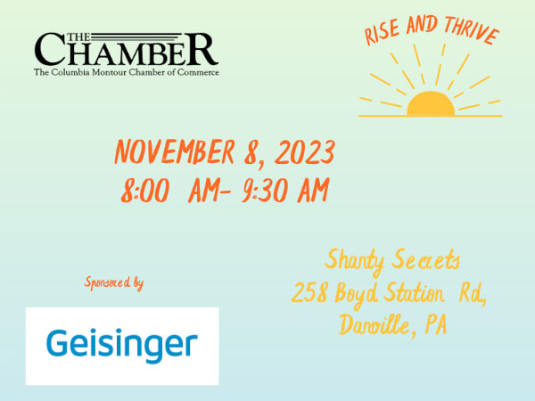 The Columbia Montour Chamber of Commerce is delighted to continue our “Rise & Thrive” events, sponsored by Geisinger. On November 8, our Small Business of the Year, Shanty Secrets, will host us for breakfast – but not just any breakfast – we’ll talk about practical nutrition/eating tips for “on the go” workers, and we’ll discuss business in Montour County.
